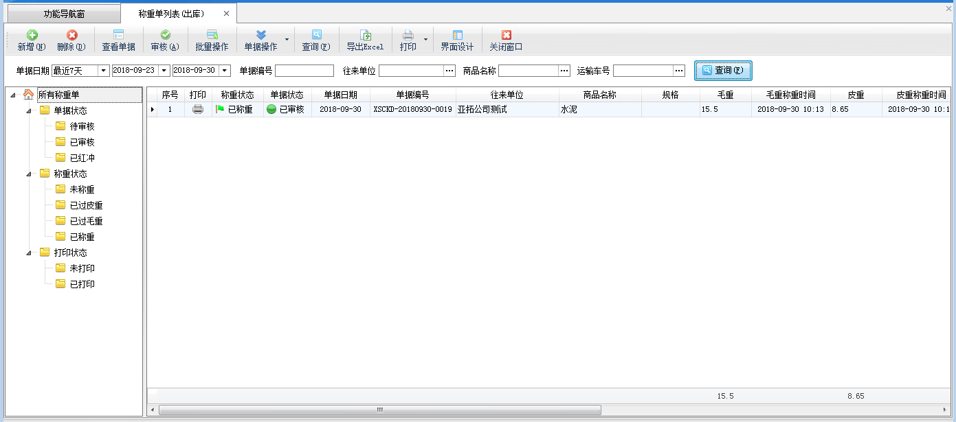 功能描述:可以連接稱重設備自動讀取稱重數據,軟件內支持“稱重兩次”、“稱重一次自動去皮重”、“稱重一次不要皮重”三種方式,可以自由設置稱重方式,對稱重的單據數據進行記憶。有效管理稱重數據,提高工作效率。已開的單據記錄軟件中支持查詢。