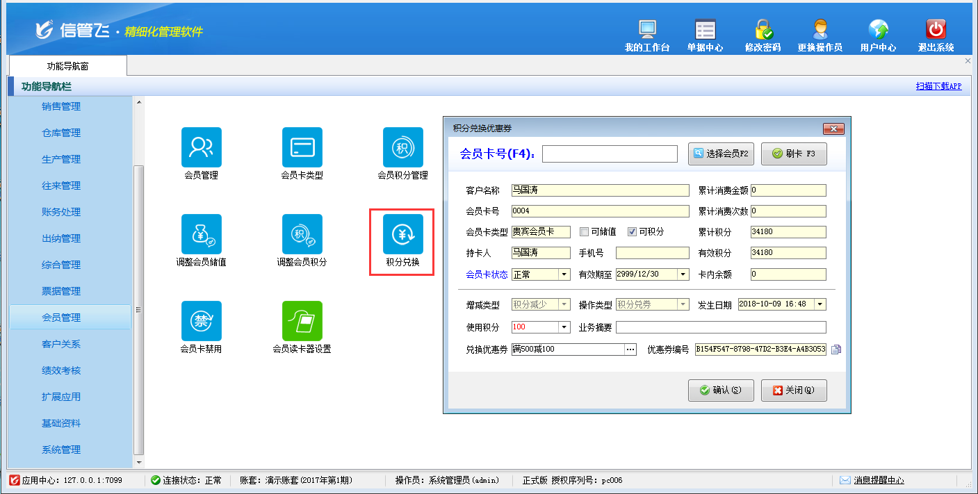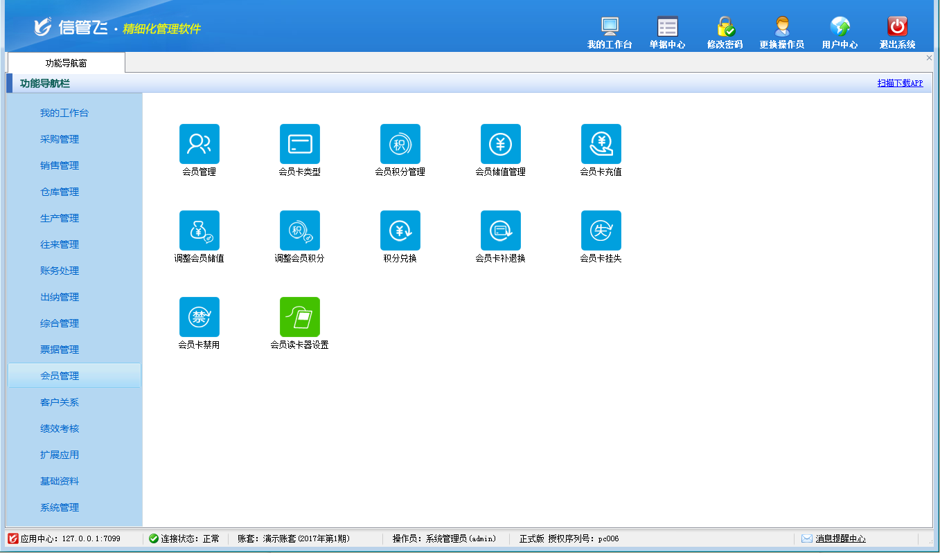 包括功能:會員卡類型維護、會員積分管理、會員儲值管理、調整會員儲值、調整會員積分、會員卡充值、積分兌換、會員卡補退換、會員卡掛失、會員卡禁用、會員讀卡器配置等。
