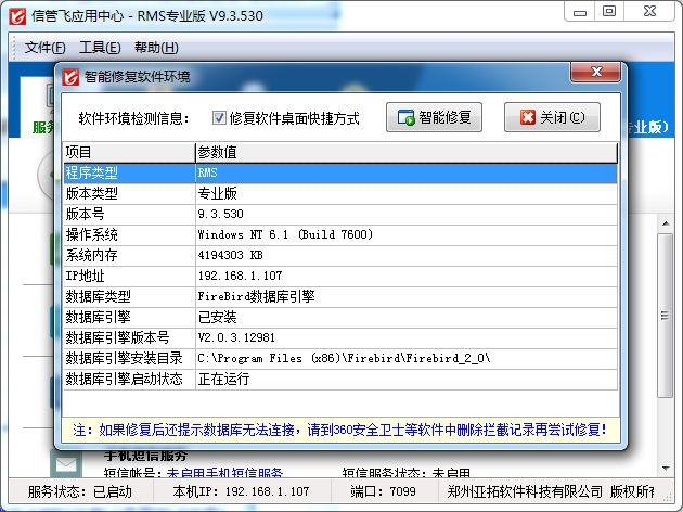 ????在應用中心點擊菜單“工具”—》“智能修復軟件環境”,然后點“智能修復”按鈕,軟件會自動重建數據庫環境,并創建桌面快捷方式。