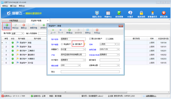 許多用戶在使用軟件記賬時都會問到一個問題:如何新增現(xiàn)金賬戶和銀行賬戶?本節(jié)我們以信管飛RMS專業(yè)版來介紹一下進銷存軟件內(nèi)如何新增資金賬戶? 在功能導(dǎo)航窗點擊“基礎(chǔ)資料”—“資金賬戶”打開資金賬戶信息界面,點擊工具欄中的“新增”按鈕,在彈出的“資金賬戶—新增”窗口錄入賬戶名稱、勾選賬戶類型“現(xiàn)金賬戶”、期初余額及其他相關(guān)信息后點擊“保存”按鈕即可保存到系統(tǒng)內(nèi),如下圖 點擊工具欄中的“新增”按鈕,在彈出的“資金賬戶—新增”窗口錄入賬戶名稱、勾選賬戶類型“