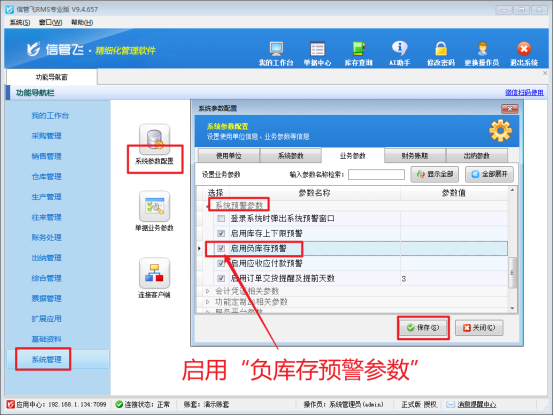 啟用這一強大功能十分便捷。在軟件的功能導航欄中,依次點擊“系統管理”—“系統參數配置”—“業務參數”,即可進入“業務參數”配置界面。在系統預警參數下,輕松勾選“啟用負庫存預警”參數,然后點擊“保存”按鈕,配置就完成了。整個過程簡單易懂,無需復雜的技術知識,即使是初次使用的員工也能快速上手。